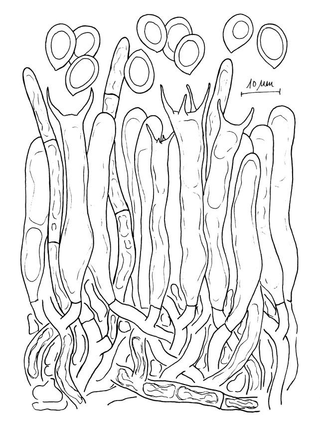 Basidiocarpo resupinado, efuso, adnado, ceréo. Himenóforo liso, poruloso, de color amarillento a ante crema. Margen indiferenciado. Sistema hifal monomítico. Hifas con septos simples; hifas subhimeniales de paredes delgadas, de 3-5 micras de ancho, hifas subiculares con paredes distintivas o ligeramente engrosadas, de hasta 12-14 micras de ancho, hialinas o de color amarillento a marrón pálido, con abundante contenido oleoso marrón. Cistidios hifoides, de hasta 100 micras de largo y 3-5 micras de ancho, de paredes delgadas, con varios septos simples, con gotas de aceite irregulares. Basidios subcilíndricos, de 50-70 x 6-9 micras, con 2-4 esterigmas, con un septo basal simple, con abundante contenido oleoso. Basidiósporas elipsoides a subglobosas, de 8-12 x 6-7,5 micras, lisas, con paredes definidas y una gran gútula, IKI-, no cianófilas.