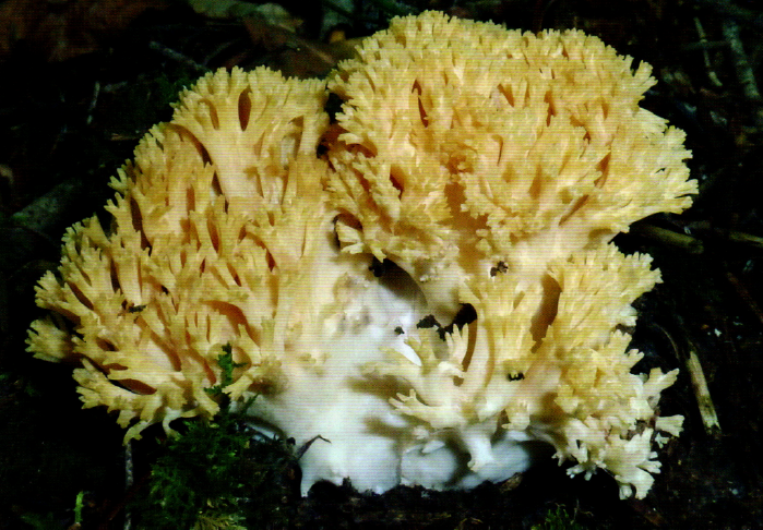Basidiocarpos coraliformes, densamente ramificados, entre las mayores del género, alcanzando hasta 180 mm de altura y 150 mm de anchura. En ejemplares jóvenes presentan aspecto de coliflor. Tronco basal bien desarrollado, robusto, de hasta 70 mm de alto y 30–40 mm de ancho en la parte superior, de subcilíndrico a obcónico, con base a veces puntiaguda y notablemente incrustada en el suelo; puede ser solitario o formar conjuntos de dos o tres elementos soldados en una mata única. Frecuentes los grupos de ramillas abortivas. Color blanco en la base, con tonalidades ascendentes similares a las de las ramas. Ramas principales numerosas, de 10–16 mm de grosor en la inserción con el tronco, reiteradamente ramificadas y adelgazadas progresivamente hacia el ápice, politómicas, de sección redondeada, lisas pero algo rugosas con el tiempo, con ángulos de ramificación mixtos (en U y en V). Los ápices terminan en 2(–4) puntas obtusas, a menudo truncadas. Color inicial del basidiocarpo blanquecino, amarillo claro, amarillo crema pálido, amarillo prímula o amarillo azufre; en la madurez adquiere tonos ocre?amarillentos uniformes. Los ápices son inicialmente de un amarillo más intenso, prontamente concoloros con las ramas. Superficie externa inmutable a las contusiones; al cabo de un día puede presentar manchas pardo?liliáceas apagadas en los puntos de presión, sobre todo en los ápices (carácter inespecífico común en muchas especies del género). Contexto blanco, a menudo marmóreo bajo alta humedad, especialmente en el tronco. Olor tenue, herbáceo; sabor suave pero ligeramente ácido en las partes apicales. Esporada ocre?amarilla.Basidiósporas Esporas (9,0–)10,0–13,5(–14,2) × (3,8–)4,0–5,5(–6,0), cilíndricas, apículo excéntrico prominente, depresión sobrehilar ligera ; perfil externo liso; verrugas coalescentes o aisladas, orientadas longitudinalmente, cianófilas, yodo?negativas, de color crema amarillento pálido. Basidios de 50–75 × 8–11 µm, predominantemente tetrasporados, con esterigmas de unos 6 µm, provistos de fíbula basal. Sistema hifal monomítico, con hifas generativas cilíndricas, septadas, en ocasiones con artículos cortos moniliformes, de hasta 18 µm de ancho, pared gruesa (hasta 1 µm), lisas aunque a veces débilmente incrustadas; segmentos hifales con pared ligeramente gelatinizada (incoloras en rojo Congo); presencia de hifas ampuliformes en los septos. Hifas trombopleurógenas frecuentes, con contenido amarillento. Micelio basal compuesto por hifas generativas cilíndricas, de hasta 4–6 µm de ancho, pared delgada e hialina, con finas incrustaciones cristalinas dispersas. Fíbulas presentes regularmente en la base de los basidios y en el subhimenio, poco frecuentes en otras regiones del basidiocarpo.