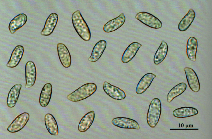 Esporada amarillo ocráceo. Basidiósporas de (8,2–)?9,6?(–11,1)?×?(3,5–)?4,4?(–5,2)?µm, de forma oblongoide a brevemente boletoide, con apículo excéntrico poco marcado y ligera depresión suprailar. Ápice por lo general redondeado, a veces subogival; pared gruesa (hasta 0,2?µm) y perfil algo irregular, ornamentadas con verrugas elevadas visibles con azul de algodón, cianófilas, inamiloides, de color crema amarillento pálido en agua. Basidios de 55–75?×?9–11?µm, tetraspóricos, cilíndrico–claviformes, a veces con ligeras constricciones preapicales; esterigmas rectos o curvados, de hasta 6–7?µm. En ejemplares jóvenes presentan contenido homogéneo que luego muestra pequeñas gotas refringentes, con fíbula basal. Sistema hifal monomítico, formado por hifas generativas septadas. En el subhimenio de hasta 5?µm de grosor, de segmentos cortos, entrelazadas y aglutinadas. En las ramas, hasta 8–10?µm, hialinas, subparalelas o entrelazadas, de forma subcilíndrica a fusiforme; con segmentos largos y frecuentes hifas ampuliformes en los septos (hasta 15?µm). Contienen gránulos refringentes; pared gruesa (hasta 1,2?µm), a menudo gelificada, lisa, con cristales refringentes polimorfos de tamaño medio. En el tronco: hifas de hasta 12?µm, hialinas, cilíndricas o fusiformes, aglutinadas, de pared gruesa (hasta 1,2?µm), con textura gelatinosa. En la matriz se encuentran hifas ampuliformes frecuentes (hasta 16?µm) con contenido granular refringente, y abundantes cristales de pequeño a mediano tamaño, comúnmente cuadrangulares. Miceliobasal: hifas generativas septadas, cilíndricas, hialinas, entrelazadas, de hasta 4?µm de diámetro, pared gruesa (hasta 1?µm), gelificada; hifas ampuliformes ocasionales; cristales raros, cuando presentes, de forma polimorfa. Fíbulas poco comunes, visibles solo bajo observación detallada en la trama y en la base de los basidios.
