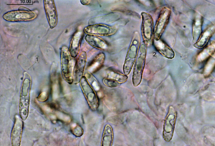 Contexto blanquecino, a veces de aspecto marmóreo en el tronco con alta humedad, frágil en las ramillas superiores; olor tenue, herbáceo; sabor suave pero algo astringente en los extremos apicales. Esporadaocráceo-amarillento. Basidiósporas: de 13,5–18 × 3,5–5 µm; cilíndricas, a veces flexuosas, con ápice redondeado, ocasionalmente atenuado o giboso, apículo marcado y una depresión suprahilar profunda; a menudo con una o más gutúlas y contorno irregular. Ornamentación formada por verrugas altas, irregulares, aisladas o con cortas conexiones; moderadamente congófilas, cianófilas, no amiloides, de color crema amarillento en agua. Basidios de 60–80 × 8–11 µm, cilíndrico-claviformes, tetraspóricos o bispóricos, a veces monospóricos, con esterigmas de hasta 7–8 µm de largo; sin fíbulas basales. Sistema hifal monomítico, compuesto por hifas generativas septadas, cilíndricas, flexuosas o rectas. Cerca de la superficie externa son irregulares, y regulares o subparalelas en la trama interna del tronco y las ramas. En el subhimenio presentan elementos cortos, de 2–8 µm de ancho y pared delgada; en la trama de las ramas, hifas de 3–15 µm con pared de hasta 0,5 µm, más o menos regulares. Frecuentes hifas ampuliformes en los septos, de hasta 20 µm de diámetro; presencia de sustancia gelificada y de depósitos cristalinos polimorfos refringentes, más raros los cristales en forma de roseta; ocasionales hifas trombopleurógenas. Micelio basal formado por hifas generativas septadas, de 3–6 µm de ancho, paralelas, con hifas ampuliformes en los septos (hasta 12 µm) y depósitos cristalinos polimorfos, dispersos o recubriendo parcial o totalmente las paredes hifales. Fíbulas ausentes en todos los tejidos.