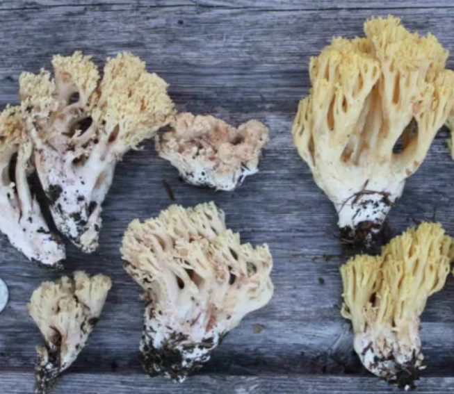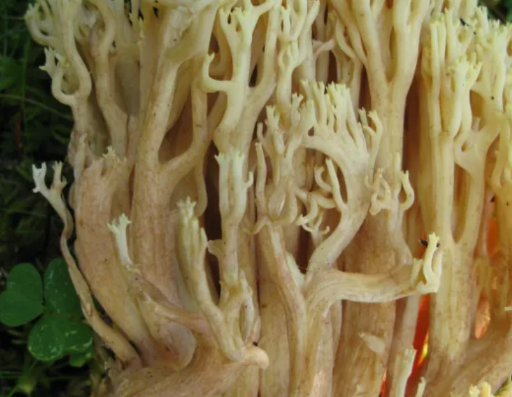 Basidiocarpos de tamaño mediano, típicamente con una ramificación finamente dividida en el ápice.Tronco basal liso con una base puntiaguda. Color variable, generalmente amarillo limón a amarillo azufre, aunque puede llegar a ser casi completamente pálido. Contexto y superficie que adquieren manchas de color gris rosado a gris púrpura al presionarse y envejecer. Olor característico, que se ha relacionado con el azafrán, medicamentos, yodoformo y sabor es ligeramente amargo en los extremos de las ramificaciones. Basidiosporas de12-15 × 4 -4,5 micras, cilíndricas, a menudo algo irregulares o más gruesas en el centro, y completamente lisas. Hifas quepresentan fíbulas. Hifas basales del micelio son bastante anchas y en su mayoría presentan fíbulas, careciendo de capa mucilaginosa. Generalmente no presentan cristales, aunque se observan algunas hifas basales del micelio cubiertas de cristales.