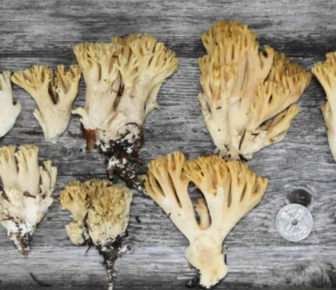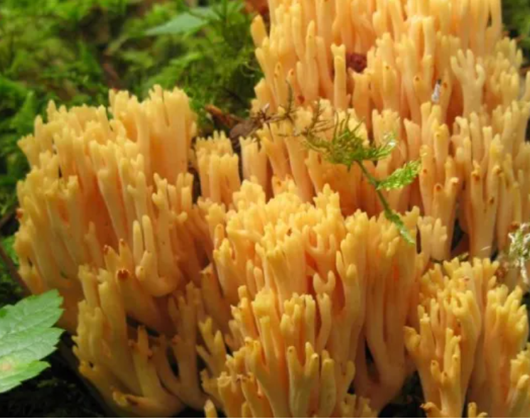 Basidiocarpos de tamaño mediano y crecen en racimos en abanico. Troncobasalliso, se estrecha hacia la base. Color variable, tornándose gradualmente de un amarillo ligeramente más cálido a amarillo yema de huevo en las puntas de las ramas, y a menudo con un distintivo matiz rosa salmón a cierta distancia de las ramas antes de desvanecerse a amarillo ocre. Contexto higrófono y marmóreo, al principio de un amarillo grisáceo sucio (al menos en la base), nunca blanco puro, a veces, se vuelve grisáceo con la edad. Olor característico, particularmente intenso en la base, y se ha sugerido que está asociado con el azafrán, la medicina, el yodoformo. Basidiósporas de 10,7-12,5 x 4,3–5 micras, cilíndricas a estrechamente oblongas, almendradas y con nervaduras bajas y rotas en hileras. Hifas que presentan fíbulas, pero estos están prácticamente ausentes en el micelio basal, que presenta hifas con cristales adpresos. Los extremos de las hifas suelen estar hinchados como puntas de lanza.