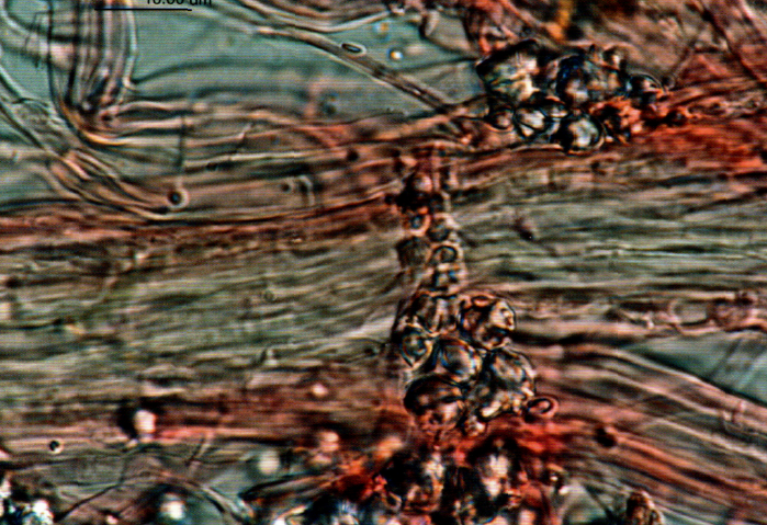 Basidiocarpos coraloides, de hasta 80 mm de alto y 50 mm de ancho, claramente ramificados. Tronco basal único, erecto o curvado, cilíndrico, aunque a veces comprimido, de hasta 25 mm de alto y 8 mm de ancho, con abundantes residuos miceliares blanquecinos en la parte inferior, matizados con el color de las ramas superiores. Ramas principales numerosas, de 2 a 4 mm de ancho en la base del tronco, lisas, de sección redondeada, ascendentes, divergentes y a menudo ramificadas. Ángulos de las ramas predominantemente obtusos (en forma de U), con las puntas generalmente terminadas en 2 (4) puntas agudas. Color de las ramas arcilla, canela, luego ocre parduzco, rosa parduzco, parduzco sucio; las puntas son algo más claras en los basidiocarpos jóvenes, que pronto se concoloran con las ramas. Superficie exterior se torna parduzco rojiza, parduzco vino, púrpura o parduzco chocolate al manipularse, en los puntos de presión y en las roturas. Contexto blanquecino, firme y fibroso en el tronco, y frágil en las ramas, al exponerse al aire, se torna marrón rojizo, al igual que la superficie exterior. Olor ligeramente herbáceo y sabor más o menos amargo. Esporada amarillo ocre. Basidiósporas de 6,4-10,1 3,6-4,9 micras, oblongas en vista lateral, subcilíndricas en la superficie, con un apículo pronunciado de 1,0 (1,2) micras de largo y con una depresión supraapical, pared delgada, perfil moderadamente ondulado, con pequeñas verrugas romas y elevadas, también evidentes en agua, a veces unidas, moderadamente congófilas, yodo-negativas, cianófilas, amarillentas en agua. Basidios de 40-60 x 6-8 micras , cilíndrico-clavados, tetraspóricos, esterigmas de hasta 6 micras de largo, con fíbula basal. Sistema hifal monomítico.Hifas generadoras cilíndricas y septadas, de 2-10 micras de ancho, subparalelas a entrelazadas, de hasta 0,5 micras de grosor, pero en el tronco, a veces de hasta 2 micras de grosor, con paredes lisas, hifas ampulares presentes en los septos y formaciones cristalinas polimórficas, hifas trombopleurogénicas ocasionales, de 2-4 micras de ancho, cianófilas de color azul algodón. Micelio basal monomítico, compuesto por hifas generadoras paralelas a entrelazadas, de 2-5 micras de ancho y hasta 0,5 micras de grosor, también intercaladas con hifas con paredes localmente "esqueléticas" y de hasta 1,5 micras de grosor. Se encuentran comúnmente hifas ampulares en los septos de hasta 10 μm, células globulares parduscas y formaciones cristalinas refráctiles, que van de polimórficas a esteliformes; no se observan acantodendroides. Fíbulas comunes en todos los tejidos.