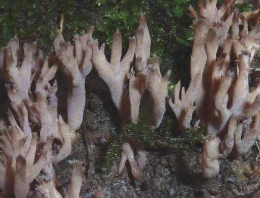 Basidiocarpos coraliformes, de hasta 50 mm de altura y 20–30 mm de anchura, con ramos ramificados de forma dispersa a densamente compacta. El tronco es poco desarrollado, ramificado cerca de la base, de hasta 20 mm de alto y unos 8 mm de grosor. Las ramas principales miden 2–3 mm de diámetro en su unión con el tronco, y sus ápices presentan un par de pequeñas puntas agudas o algo redondeadas. El color es variable, distinto al de la forma típica: va del rosado arcilloso al castaño vinoso, llegando incluso a tonos rojizo-ocres o púrpura oscuro con la madurez. Los ápices mantienen la misma tonalidad que el resto de la fructificación. La parte del pie que queda enterrada permanece mucho tiempo blanquecina. Esporada blanca. Características microscópicas similares a las de Clavulina coralloides f. coralloides. Alimentación y sustratos: Especie saprófita; crece directamente sobre el suelo, asociada a restos vegetales de hojas y madera en descomposición. Prefiere terrenos húmedos y ricos en materia orgánica, generalmente en zonas algo sombreadas o con musgos.
