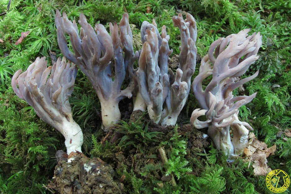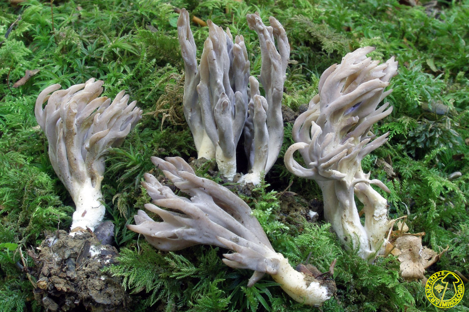 Basidiocarpocoraloides, densamente ramificados, de hasta 10 cm de altura y 2–5 cm de anchura. Tronco basal bien desarrollado, de hasta 4 cm de alto y 1–1,5 cm de ancho, cilíndrico, algo flexuoso, a veces formado por dos o tres elementos soldados en la base. Parte basal blanquecina en la zona enterrada, del mismo color que las ramas en la parte superior. Ramas principales numerosas, de hasta 6 mm de grosor en su punto de inserción, ramificadas de forma irregular y divergente, a menudo arcuadas o contorsionadas, aunque también erectas y subparalelas, adelgazándose progresivamente hacia los ápices. Sección redondeada, en ocasiones algo comprimida; superficie lisa o ligeramente rugosa longitudinalmente. Ramificación variada, con horquillas en forma de U o V. Ápices terminados en 2 (rara vez 4) pequeñas puntas agudas, que se redondean con la edad. Color del conjunto en tonalidades de gris, del claro al oscuro; ápices algo más pálidos pero pronto concoloros con el resto del basidiocarpo No presenta cambios al manipularlo ni al contacto. Contexto blanco, fibroso en el tronco, sin olor apreciable o débilmente herbáceo, sabor nulo. Esporada blanca Reacciones macroquímicas: Hidróxido de sodio (30%): pardea. Fenol (5%): pardea. Amoniaco (30%), TL4, tintura de guayaco, ácido sulfúrico (70%), ácido clorhídrico (24%), sulfato ferroso y reactivo de Melzer: reacciones negativas. Basidiosporas 7,3–10,1 × 5,8–8,0 µm, de subglobosas a elipsoidales, con apículo pronunciado de hasta 1 µm, contenidas en una gran gútula oleosa verdosa visible al microscopio, pudiendo ocupar casi toda la espora, pared fina, lisa y congófilas, hialinas, IK-. Basidios de (50–65 × 7,5–10 µm), cilíndrico-clavados, bisporicos, con contenido granuloso o con gútulas verdosas; esterigmas curvados hacia el interior, de hasta 8 µm; con fíbula basal. Sistema hifal monomítico. Hifas generativas entrelazadas o paralelas, 2,5–13 µm de grosor, con elementos cortos o largos; en la trama se observan depósitos cristalinos polimorfos e infrangentes; fíbulas presentes en todos los tejidos. Alimentación y sustratos: Especie que se desarrolla generalmente en suelo, asociada a restos orgánicos y hojarasca, tanto en bosques de frondosas (Fagus,Quercus, etc.) como en coníferas (Picea, Pinus).