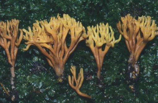 Basidiocarpo de tipo coraloide, ramificado, alcanzando hasta 50 mm de altura y unos 30–35 mm de anchura. Ramificaciones entre 2 y 6 divisiones dicotómicas, con ápices delgados, amarillos intensos o ligeramente anaranjados. Color a diferencia de la forma típica (f. corniculata), presenta un pie o zona basal de tono ocre a pardo-rojizo, a menudo anaranjado, que con la madurez se extiende hacia las ramas superiores. Superficie lisa, brillante, con textura cerosa. Contexto frágil, amarillento, sin cambios notables al corte ni olor destacable. Esporada blanca. Basidiosporas subglobosas a globosas, de (4,4–6) × (4–5,6) µm, lisas, hialinas y no amiloides. Basidios claviformes, de 36–40 × 5–6 µm, con esterigmas (2–4) de hasta 7 µm de largo. Cistidios muy escasos, de unos 44 × 7 µm. Himenio de 48–60 (hasta 80) µm de grosor. Hifas con fíbulas, de 2–8 µm de ancho según la zona del tejido. Alimentación y sustratos:Especie saprofita; crece en la hojarasca de bosques caducifolios o mixtos, sobre restos de hojas, hierbas y musgos, especialmente bajo Hedera helix.