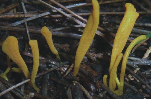 Basidiocarpos clavarioides, simples, no ramificados, de hasta 50 mm de altura y 1–3 mm de grosor. Pueden aparecer aislados, gregarios o en pequeños fascículos de dos o tres ejemplares. El pie es cilíndrico, derecho o algo curvado, generalmente apenas distinguible de la parte fértil superior, a veces con aspecto traslúcido por la humedad y con la base cubierta de micelio blanquecino algodonoso. La clavula (parte fértil) es de forma cilíndrica a clavada o algo fusiforme, a veces aplanada o comprimida, con ápice obtuso, redondeado, ocasionalmente agudo o espatuliforme. La superficie del himenóforo ocupa de dos tercios a tres cuartos de la altura total, ligeramente rugosa al principio, de color amarillo claro a amarillo intenso u oro. El contexto es frágil, de tono amarillento, con olor débilmente farináceo y sabor amargo. Esporada blanca.