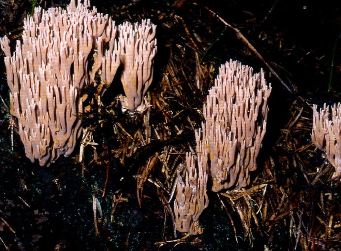 Basidiocarpos coraloides, de 50-80 (110) mm de altura y 30-50 (80) mm de ancho, muy ramificados. Tronco basal casi indistinto, insertado en el sustrato, a evidente, único, erecto a curvado, cilíndrico pero también comprimido, de hasta 30 mm de altura y 10 mm de ancho, con abundantes residuos miceliares blanquecinos en la base, del mismo color que las ramas superiores. Ramas principales de 2-4 mm de ancho en la base del tronco, lisas, redondeadas, curvadas hacia arriba, compactas, subparalelas, a veces ramificadas de forma dicotómica y tritómica. Ángulos de las ramas predominantemente obtusos (en forma de U), a veces con anastomosis. Los ápices suelen terminar en 2 (4) puntas agudas. Color de las ramas inicialmente rosa pálido, rosa pulpa, rosa parduzco, luego rojo parduzco, rosa violáceo sucio, vino canela; puntas largas y blanquecinas, que luego se concoloran con las ramas. Superficie exterior que vira a marrón vino en los puntos de presión, al manipularlas y en las roturas. Contextode color blanco cremoso, claramente zonificado, parcialmente marrón rojizo, localmente también en la porción subcortical, firme y fibroso en el tronco, frágil en las ramas. Olor herbáceo muy ligero y suave y sabor más o menos amargo. Esporada de color amarillo ocre. Basidiósporas de 5,2-8,0 (8,5) x 3,7-5,2 micras, de elipsoidales a oblongas en proyección lateral, elipsoidales en vista frontal, apículo pronunciado de hasta 1 micra de largo, paredes delgadas, perfil de arrugado a ondulado, verrugas aisladas y unidas, claramente visibles incluso en agua, moderadamente congófilas, cianófilas, yodo-negativas, amarillentos en agua. Basidios de 40-60 x 6-9 micras, cilíndrico-clavados, tetraspóricos, esterigmas de 7 micras, con fíbula basal. Sistema hifal monomítico. Hifas generativas cilíndricas y septadas, de 2-14 micras de ancho, pared lisa y delgada (hasta 0,5 micras), a veces hasta 2 micras en el tronco.Presentes hifasampulliformes en los septos e hifas trombopleurogénicas de 2-5 micras de ancho, de color ocre grisáceo, cianófilas de color azul algodonoso. Micelio basal monomítico, compuesto por hifas generativas septadas, de 2-6 micras de ancho, hialinas. La superficie externa contiene formaciones cristalinas en forma de roseta y ocasionalmente acantodendros y células globosas. En el interior, se presentan hifas generativas localmente esqueléticas, con paredes de hasta 2 micras de grosor, a veces sin lumen, junto con cristales polimórficos en forma de roseta. Ocasionalmente, se presentan hifas ampulliformes en los septos. Fíbulas presentes en todos los tejidos.