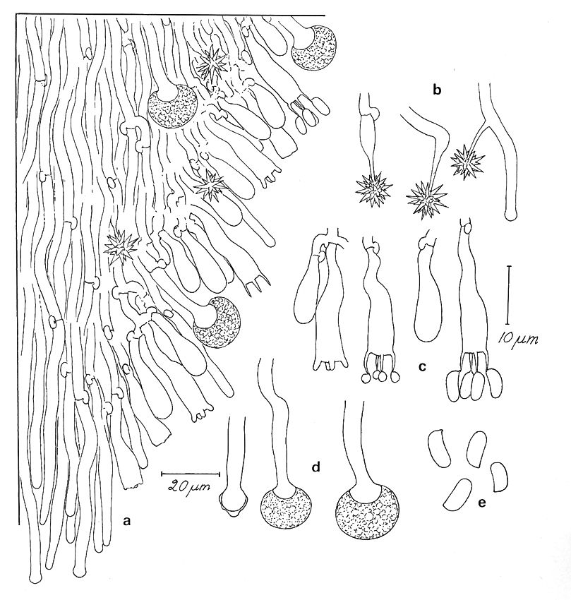 Basidiocarpo resupinado, efuso, adnado, subcéreo. Himenóforo grandinioide a odontioide, blanco grisáceo u ocráceo pálido. Acúleos cónicos a subcilíndricos. Margen indeterminado. Sistema hifal monomítico. Hifas con fíbulas, paredes delgadas, 1-5 micras de ancho. Cistidios de dos tipos: 1) halocistidios numerosos, cilíndricos con un ápice capitado, de paredes delgadas y con una fíbula basal de 15-35 x 5-10 micras , halo de 10-15 micras de ancho; 2) astrocistidios numerosos, que surgen lateral o terminalmente de hifas subuladas estrechas, incrustadas apicalmente con una capa estrellada de cristales. Basidios claviformes a subcilíndricos, 15-25 x 4-6 micras, con 4 esterigmas y una fíbula basal. Basidiósporas de elipsoides estrechas a cilíndricas, ligeramente curvadas, de 5-8 x 2,5-3,5 micras, lisas, de paredes delgadas, no amiloides.