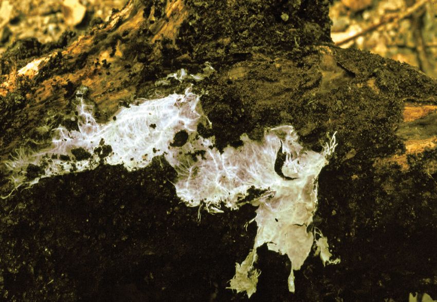 Basidiocarporesupinado, extensamente adherido al sustrato (efuso), de aspecto aracnoide a pelicular. Superficie del himenóforo blanca, más o menos brillante, a veces con aspecto algodonoso fino. Margen fibriloso, algo poco definido y con hifas sueltas visibles bajo la lupa. Sistema hifal monomítico, con hifas finas (2–4 µm), paredes delgadas y con fíbulas. Hifas subiculares muy largas y algo distanciadas, con fíbulas dispersas y incrustaciones de cristales granulares. Basidios cortamente claviformes, de (15–)17–20 × 5–6 µm, con pared delgada, cuatro esterigmas y una fíbulas basal evidente. Basidiosporas elipsoidales, (5–)5.5–7 × 3–3.5 µm, verrugosas, de contorno algo irregular, pared delgada, no amiloides (IKI–). Alimentación y sustratos: Hongo saprófito; crece sobre restos muy degradados de madera muerta, probablemente de angiospermas, en estados muy avanzados de descomposición.