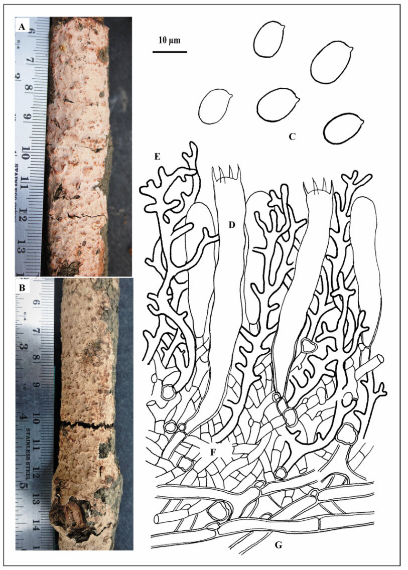 Basidiocarpo anual, resupinado, adnado, confluente, de hasta 120 micras de grosor. Superficie himenial lisa, de color rojo pálido en estado fresco, blanco rosado después del secado. Borde adelgazado, de concoloro a concoloro más pálido. Sistema hifal monomítico. Hifas generativas ramificadas, septadas y fíbuladas, de hasta 4 micras de ancho. Hifas basales paralelas al sustrato, escasamente ramificadas, de paredes delgadas a algo gruesas. Hifas subhimeniales verticales, muy ramificadas y de paredes delgadas. Dendrohifidios de hasta 3 micras de ancho. Basidios de 60-80 × 7-8 micras, tubulares, sinuosos o algo constreñidos, con base de paredes gruesas y fíbula basal, 4 esterigmas; esterigmas de hasta 4 micras. Basidiósporas de 8-14 × 7,5-9, micras, elipsoides, de paredes delgadas, lisas, no cianófilas, no amiloides.