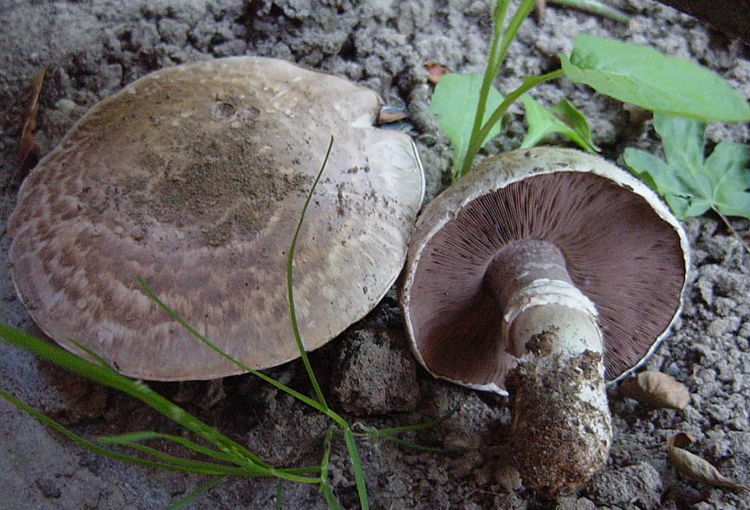 MACROSCOPÍA: Sombrero de 10-14 cm de diámetro, de globoso a plano-convexo, a menudo con formas trapezoidales; cutícula de color pardo a pardo negruzco, disociada en pequeñas escamas por todo el sombrero concentricamente, dejando ver el fondo color crema, margen involuto, excedente, blanquecino o pardo claro, con restos blanquecinos de velo parcial y en algunas ocasiones, restos de velo general de color pardo. Se mancha de pardo al roce. Láminas libres, anchas, rosadas al principio y finalmente rosado-grisáceo que llegan a negruzcas. arista blanquecina. Pie de 6-13 x 2-4 cm, cilíndrico, atenuada en la base, redondeada o en punta, a veces estrechándose en el tercio inferior; compacto, a veces hueco en la nadurez ( con sección en forma de rombo) en la unión con el pie, con el sombrero, blanco, algo más crema en la base, por debajo del anillo está adornado de escamas de color pardo, del mismo color que el sombrero y que pueden formar zonas anulares a modo de anillos impefectos, aunque pueden llegar a desaparecer en la madurez. Anillo súpero, doble, membranoso, muy amplio, grueso, insertado muy alto, casi al nivel de las láminas, blanco, adornado con escamas de color pardo en la cara inferior. Carne compacta, gruesa, blanca, que cambia de color al corte, adquiriendo tonos rosados, pardo-naranja, tanto en el pie como en el sombrero. Sabor y olor fúngico, agradable.