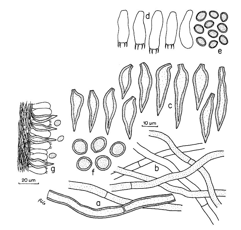 Basidiocarpos anuales, resupinados, ampliamente efusos, de hasta 50 cm o más, duros y quebradizos al secarse, desarrollándose bajo las capas externas de albura o bajo la corteza y rompiéndola. Margen fértil en los especímenes estudiados. Superficie de los poros de color marrón amarillento brillante a marrón oscuro opaco, a menudo muy rugosa y con excrecencias en forma de clavija, que se agrietan,. Poros de circulares a angulares, muy variables en tamaño, de 1-6 por mm; disepimentos gruesos y enteros que generalmente se vuelven delgados y profundamente lacerados. Contexto de color marrón amarillento a marrón rojizo oscuro, no zonado, firme, de hasta 1 mm de espesor. Capa tubular concolora con el contexto o a veces de color marrón amarillento brillante, de hasta 1 cm de espesor pero a menudo con extensiones en forma de clavija de hasta 2 cm de largo. Sistema hifal monomítico. Hifas generativas, mayormente de color marrón amarillento pálido a marrón oscuro en solución de KOH, paredes delgadas a moderadamente gruesas, con ramificación ocasional, 2,5-5 micras de diámetro. Hifas setales raras a frecuentes, de paredes gruesas, de 3-6 micras de diámetro. Hifas tramales de color amarillento pálido a marrón oscuro, paredes delgadas a gruesas, de 3-6 micras de diámetro. Setas himeniales frecuentes, apenas proyectantes o incrustadas en la capa himenial, subuladas a ventricosas, de 20-45 x 8-11 micras. Basidios claviformes, de 17-20 x 5-6 micras. Basidiósporas ampliamente elipsoides, amarillentas, paredes gruesas, de 5,5-8 x 4-5 micras.