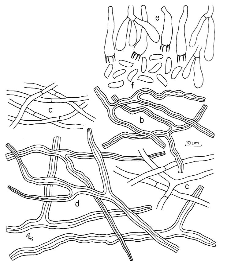 Basidiocarpos anuales, unidos al sustrato por una base estrecha. Píleo al principio ungulado, luego convexo, dimidiado, solitario o imbricado en pares, de 6-18(24) cm de ancho y hasta 4,5 cm de grosor. Superficie estéril de color blanco amarillento a naranja grisáceo, con una cutícula delgada y finas fibrillas de color marrón a naranja grisáceo, que se vuelven areoladas. Superficie porosa de blanquecina a naranja amarillenta. Poros circulares, 1-3 por mm. Capa tubular del mismo color que el contexto, de hasta 1 cm de grosor. Contexto de blanco a crema, de hasta 3 cm de grosor, carnoso, resistente al secado y corchoso. Sistema hifal dimítico. Hifas generativas hialinas, de paredes delgadas, de 2,5-6 micras de ancho, en la superficie del píleo embebidas en materia amorfa. Hifas esqueléticas hialinas, de paredes gruesas, no septadas, de hasta 13 micras de diámetro. Basidios claviformes, con 4 esterigmas, 18,5-40,5 x 5-7 micras, con una fíbula basal. Cistidios ausentes. Basidiósporas cilíndricas a ligeramente fusiformes, de (6,5)7,2-10 x 2,5-3,4 micras.