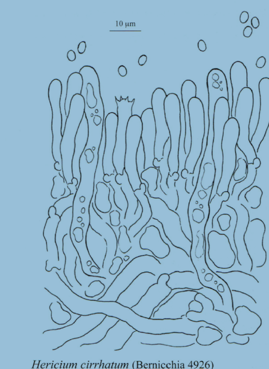 Basidiocarpo pileado, dimidiado a semicircular, carnoso, con crecimiento imbricado. Superficie superior estéril más o menos lisa a granulosa o tomentosa, de color crema. Himenóforo hidnoide con espinas de 1-2 cm de largo, crema amarillento, contexto fibroso, blanquecino. Sistema hifal monomítico. Hifas con fíbulas, de paredes delgadas, frecuentemente ampulliformes y de tamaño variable, generalmente de 4-8 micras de ancho, hialinas. Gloeocistidios cilíndricos, sinuosos, de unos 100 x 6-8 micras, con contenido granular. Basidios claviformes, de 25-35 x 4-5 micras con 4 esterigmas y fíbula basal. Basidiósporas elipsoides a subglobosas, 3,5-4,5 x 2,5-3,5 micras, lisas al microscopio óptico (rugosas al SEM), hialinas, amiloides.