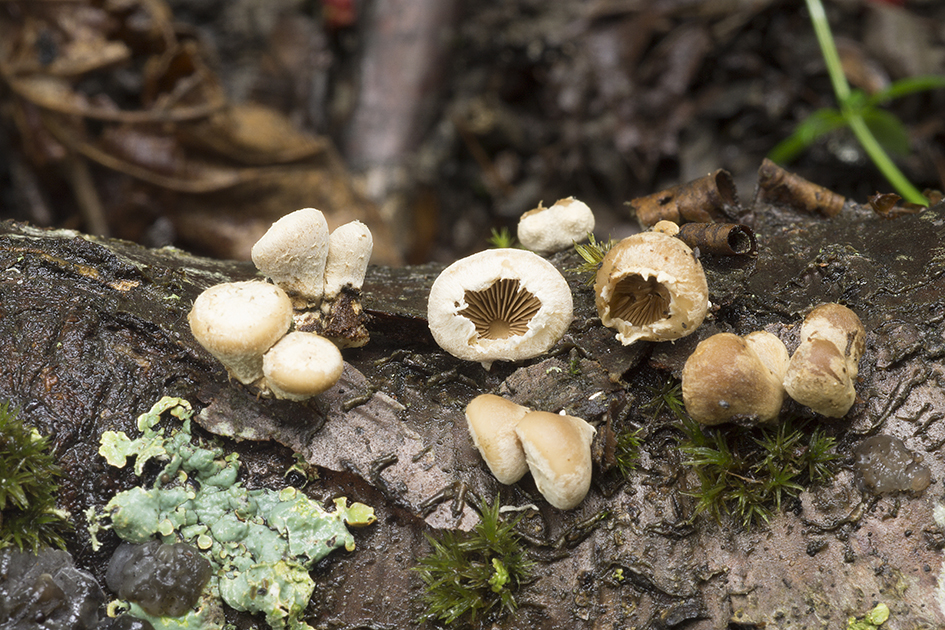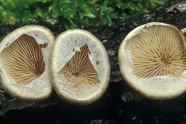 CARACTERISTICAS: Pequeñas fructificaciones convexas, que alcanzan hasta2 cm de diámetro, son de color ocráceo pálido, resupinadas, sésiles e insertas al substrato por un punto central o excéntrico, Y finamente vilosas. Los ejemplares jóvenes están cubiertos por un velo elástico, membranoso y blanco. Este velo se disarega al progresar el crecimiento, y quedan de él alaunos restos apendiculados en el margen, como puede apreciarse en la foto grafía, Las láminas son amarillo-ocráceas y van oscureciendo con la edad. Carne dura y coriácea. Esporada grisácea, MICROSCOPÍA: Esporas cilíndrico-arqueadas, de 3-4 x 1-1,5 micras, ligeramente amiloides, a veces difícil de apreciar. HÁBITAT: Fructifica en ramas muertas de planifolios.