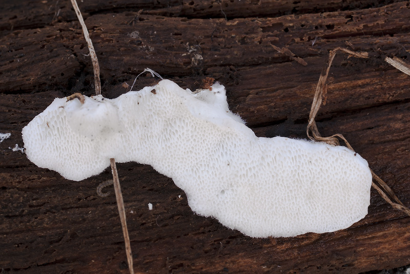 Basidiocarpos anuales, resupinados y anchos, de 10 a 15 cm de longitud, adherentes, pero que se desprenden fácilmente del sustrato. Márgenes delgados, estériles, algodonosos-tomentosos. Superficie porosa es de color blanco a ocre cremoso claro. Poros redondeados-angulares, 4-6 por mm. Disepimentos muy delgados y enteros. Subículo blanco, no zonado, delgado, de menos de 1 mm de grosor. Tubos monoestratificados, muy frágiles cuando están secos, concoloros a la superficie porosa, sin una separación clara del subículo y de 2-3 mm de grosor. Sabor es marcadamente amargo. Sistema hifal monomítico. Hifas generativas hialinas, con fíbulas, ramificaciones escasas, paredes delgadas o ligeramente engrosadas, 2,5-4 micras en el subículo; en la trama , las hifas tienen paredes delgadas, de 2-3 micras de diámetro, y a veces están entrelazadas. Basidios claviformes, hialinos, fíbula basal, tetraspóricos, 15-18 × 4-6 micras. Basidiósporas hialina, lisas, paredes delgadas, cilíndricas a elipsoidales, 4-5 × 2-2,5 micras. Cistidios escasos o numerosos, ventricosos, pared engrosada, una corona apical de cristales, rectos o con la parte basal plegada, 15-30 × 5-8 micras y se originan en las ramas o porciones terminales de las hifas de la trama.