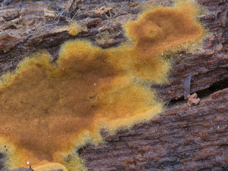 MACROSCOPÍA: Basidiocarpo resupinado, efuso, débilmente adherido a separable, arenoso a bisoide o flojamente tomentoso, membranáceo suave, hasta 0.5 (1) mm de espesor. Himenóforo discontinuo a continuo, irregular, granuloso, hidnoide, marrón ferruginoso, rara vez marrón rojizo oscuro. Acúleos cónicos, no bien formados, a menudo concrescente, hasta 0.1 (0.2) mm de largo, peniciliado en el ápice debido a las hifas que se proyectan como cistidios. Subículo poco a bien desarrollado, arachnoide a hypochnoide o fibroso blando, de color marrón amarillento claro a marrón fuerte, normalmente más pálido que la superficie fértil. Margen indistinto, casi fértil en toda su extensión o diluyéndose indefinidamente, arachnoide a bisoide, amarillento a naranja amarillento o pardusco, claramente más pálido a casi concolor con el subículo. Rizomorfos frecuentes en el subículo y el sustrato si están bien descompuestos, son oscuros o se encuentran fácilmente en los márgenes, flexibles, compactos, ligeramente pilosos a casi lisos, de hasta 0,1 (0,2) mm de diámetro, de color marrón amarillento claro a ocráceo. MICROSCOPÍA: Sistema de hifas, con hifas esqueléticas en el subículo y rizomorfos. Hifas generativas con septos simples. Hifas subiculares de dos tipos: 1) hifas generativas regulares, (1,5) 2–3,5 (4) micras de diámetro, con pared fina o ligeramente engrosada, subhialinas a marrón amarillento pálido; 2) hifas esqueléticas regulares, rectas, de 1–1,5 (2) micras de diámetro, con poca frecuencia con algunas curvas en forma de codos, con pared sólida, amarillentas. Hifas subhimeniales casi regulares, 2,5–4 (5) micras de ancho, paredes delgadas, subhialinas a marrón amarillento pálido. Cistidios ausentes, pero con hifas diferenciadas evidentes que se proyectan desde el himenio y más o menos dispuestas en paralelo en el núcleo de los aculeos, que surgen principalmente de hifas subiculares y trámales, cilíndricas, con pared gruesa, de hasta 200 (250) micras de largo y 5– 6 (8) micras de ancho, con tabiques simples repetitivos a lo largo de su longitud, de color marrón amarillento. Basidios claviformes a claviformes estrechos, a veces casi tubulares, sinuosos, (35) 45–70 (100) x (5) 6–9 (13) micras, hialinos a subhialinos, a menudo con contenido ocráceo; (2) 4 esterigmas de hasta 5 micras de largo y 1–2 micras de ancho en la base. Esporas de contorno regular a irregular o ligeramente lobulado, cara frontal globosa a más o menos indistintamente de 4 a 7 lóbulos, cara lateral y polar mayoritariamente elipsoides, de 6-10 micras de diámetro, verrugoso a equinuladas, a menudo con verrugas bifurcadas o trifurcadas o lóbulos pequeños, con pared ligeramente engrosada, de color marrón amarillento a marrón. HÁBITAT: Madera de árboles caducifolios y coníferas.