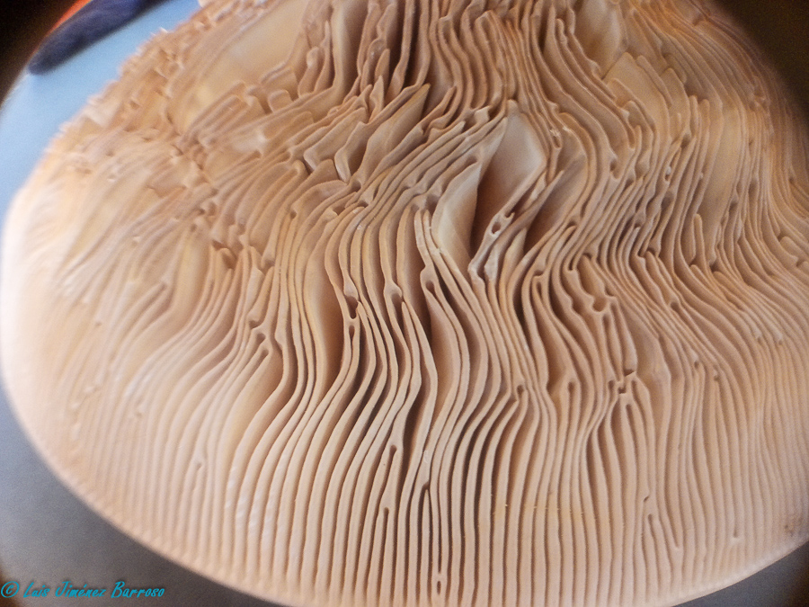MACROSCOPÍA: Basidiocarpo sésil, normalmente semicircular, de 10-35 x 3-19 cm, de consistencia suberosa, fibrosa. Superficie estéril pubescente, de forma irregular de joven, glabra y más o menos plana de adulta, zonada, con verrugas esféricas en los ejemplares adultos, de color gris, gris oscuro, gris lilacino o gris negruzco. Margen de color blanquecino a crema. Himenóforo de estructura laminar. Lamelas finas, engrosadas en individuos jóvenes, ramificadas dicotómicamente, especialmente cerca del punto de unión con el sustrato, con 3-7 laméluas cada centímetro y una altura de 15-20 mm. Cuando están maduras, las lamelas se desgarran irregularmente y están cubiertas por una pruina blanquecina, de color amarillo ocre y numerosas anastomosis hacia el punto unión con el sustrato, más raro hacia los márgenes. . Contexto fibroso, suberoso, de color crema. Olor y sabor suaves. MICROSCOPÍA: Sistema de hifas trimítico. Hifas generativas hialinas, ramificadas, septadas, con fíbulas, paredes delgadas, 2-4 micras de diámetro. Hifas conectivas, muy ramificadas, paredes gruesas, curso tortuoso, 2-4.5 micras de diámetro. Hifas esqueléticas con paredes gruesas, hialinas, desprovistas de septos, ramificaciones escasas, 2-5 micras de diámetro. Basidios con 4 esterigmas y fíbula basal, hialinos. Cistidios numerosos, cónicos, con el ápice afilado o romo, se forman en los extremos de las hifas cognitivas ramificadas, pero con menos ramas que las que se pueden observar en Lenzites betulina. Esporas cilíndricas, lisas, paredes delgadas, ligeramente arqueadas, hialinas, gutuladas, de 7-10 x 3-4 micras, IKI-. HÁBITAT: Fructifica sobre madera de planifolios, agente de pudrición blanca.