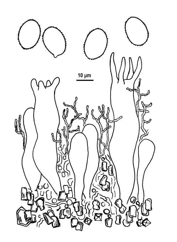 Basidiocarpo efuso, formando pequeños parches, luego confluente. Superficie himenial lisa, con una consistencia calcárea, color blanco puro. Margen determinado, adnado, aflojándose con la edad. Sistema hifal monomítico. Hifas con septos simples o con fíbulas ocasionales, de paredes delgadas, de 2-5 micras de diámetro, contexto densamente cubierto por abundante materia cristalina. Dendrohifidios ricamente ramificadas, cubiertos por cristales. Cistidios irregularmente cilíndricos a claviformes, de 30-40 x 8-15 micras, con contenido granular amarillento en KOH, difícil de distinguir de los basidios inmaduros. Basidios sinuosos, claviformes a cilíndricos o suburniformes, de 80-100 x 15-20 micras, con 4-sterigmata, esterigmas robustos y romos cuando inmaduros, de hasta 20 micras de largo cuando maduros. Basidiósporas de elipsoides a ovoides, de 18-22 x 14-16 micras, de paredes delgadas, finamente equinuladas, con apículo poco evidente no amiloides.