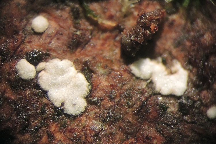 Basidiocarpo resupinado, pequeño y delgado, , adnado, de blanquecino a grisáceo. Superficie himenial lisa, incluso pruinosa. Margen determinado. Sistema hifal monomítico. Hifas simple-septadas, de 1-2 micras de ancho, con numerosos cristales. Dendrohifidios numerosos, densamente ramificados, de 1-2 micras de ancho. Cistidios ausentes. Basidios claviformes, de 15-25 x 6-8 micras, con 4 esterigmas y un septo basal simple. Basidiósporas amigdaliformes, de 8-11 x 5-7 micras, lisas, de paredes ligeramente gruesas, con apículo evidente, gutuladas, inamiloides y cianófilas. Sustrato: ramita de Corylus avellana.