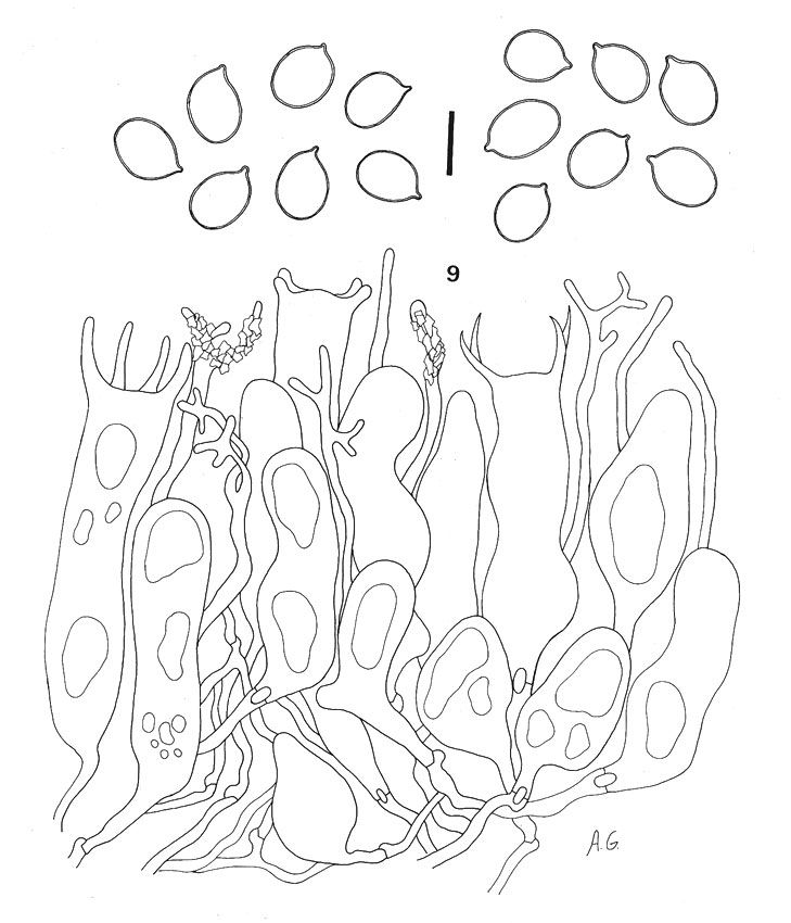Basidiocarpo corticioide, en parches irregulares de 2-20 mm de largo y 2-5(-6) mm de ancho, fácilmente confluentes, formando áreas lineales y efusas de longitud indeterminada. Márgenes determinados, adnados. Fructificación de 50-80 µm de espesor en sección transversal; textura finamente pruinosa a subcerácea, adherente. Superficie himenial de blanca a blanco sucio o pálida; ligeramente rimosa al secarse. Sistema hifal monomítico, oscurecido por abundante cristalización. Hifas irregulares, de paredes delgadas, ramificadas con fíbulas dispersas y discretas, de 1,5-2(-2,5) micras de diámetro; hifas basales de hasta 3 micras de diámetro, con paredes parcialmente engrosadas. Dendrohifidios delicadamente ramificadas, de 1-1,5 micras de diámetro, con ramas incrustadas o colapsadas, difíciles de distinguir. Basidios son subpiriformes-clavados, de 25-30(-37) x 8-11 micras, con (2-)4 esterigmas de hasta 10 micras de largo y 2 micras de ancho en la base. Basidiósporas subpiriformes a globosas en la madurez, de 8-10 x 8-8,5(-9,5) micras, solitarias o adherentes en grupos de (2-)4, apículadas, de paredes delgadas, lisas, no amiloides.