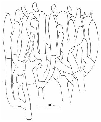 Basidiocarpo anual, de resupinado a efuso, de hasta 4mm dee spesor, en fresco blando y esponjoso, en seco duro y frágil. Margen blanco y ancho que contrasta con el himenóforo. Himenóforo meruloide, casi porado. Poros angulares, 2-4 por mm. Tubos con himenio hasta en los tabiques, color anaranjado a rojo oscuro. Contexto blanco,blando, algodonoso-fibroso, de hasta2 mm de espesor, Olor y sabor no destacables. Sistema de hifas monomítico. Hifas generativas sin fíbulas, las subhimeniales de pared delgada, lisas, de hasta 4 micras ramificadas en ángulo recto; las del subiculo y trama de pared ligeramente gruesa, de 6-8 micras, con frecuencia incrustadas. Basidiósporas cilíndricas a alantoides, de 4-6 x1-1,5 micras, hialinas, lisas, no amiloides, Cistidiolos de ápice acuminado.