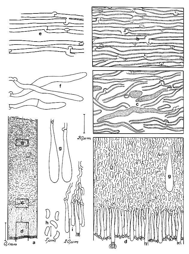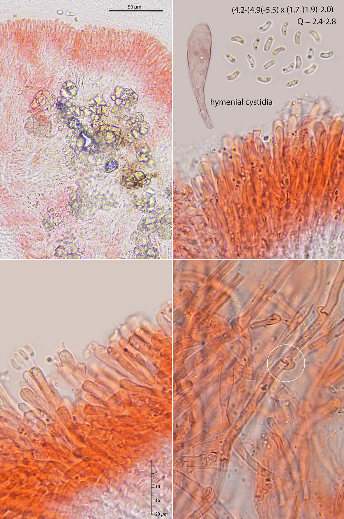 MICROSCOPÍA: Esporas subalantoides, de 4'5-5'5 x 1'5-2 micras, hialinas, lisas, no amiloides. Cistidios claviformes, inmersos con contenido resinoso. Sistema de hifas monomítico. Hifas generativas con fíbulas, las subhimeniales de pared delgada, muy ramificadas, las subiculares de pared gruesa, densamente organizadas, en la base paralelas al sustrato, todas hifas embebidas en una matriz gelatinosa.