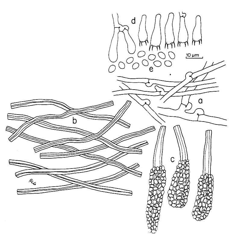 Basidiocarpos anuales, resupinados, efusos, hasta 5 cm, frágiles, se separan fácilmente del sustrato. Margen de color crema, fimbriado a rizomorfico. Superficie de los poros de color ante pálido a ante rosado. Poros angulares e irregulares. 2-5 por mm; disepimentos finos, que se vuelven lacerados. Subículo de menos de 1 mm de grosor, blanco marfil, fibroso.Capa tubular concolora con la superficie de los poros, de hasta 1 mm de grosor. Sistema hifal dimítico. Hifas generativas subiculares de paredes delgadas. Hialinas, con pinzas, rara vez ramificadas, de 1,5-5 micras de diámetro. Hifas esqueléticas subiculares de paredes gruesas, hialinas, no septadas, con escasa ramificación, de 2-4 micras de diámetro. Hifas tramales similares. Cistidios abundantes, de paredes gruesas, clavados a fusoides, completamente incrustados apicalmente, 60-80 x 8-15 micras, completamente embebidos o proyectados hasta 30 micras, se originan en el subhimenio como extremos de hifas esqueléticas subiculares. Basidios claviformes, con 4 esterigmas, 14-20 x 4-6 micras, con una fíbula basal. Basidiósporas de ovoides a elipsoides, hialinas, lisas, no amiloides, 3,5-5 x 3-3,5 micras.
