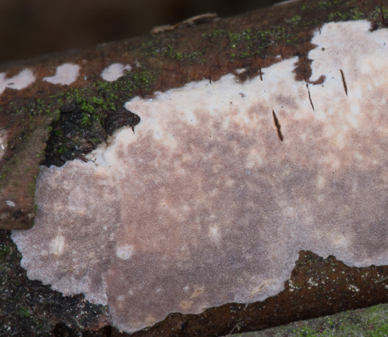 Basidiocarpoadnato, sobre corteza secundaria lisa forma parches orbiculares que luego se hacen confluentes; sobre corteza primaria es más efuso, de tamaño pequeño o moderado, con 0,1-0,2 mm de espesor, liso y continuo, pero con la edad, especialmente en corteza primaria, se agrieta en piezas transversales. Elhimenio muestra tonos gris rosáceo a ocre pálido, a veces con matices lila u naranja en el hongo fresco. El margen se adelgaza sin diferenciarse notablemente. El sistema hifal es monomítico, con todas las hifas provistas de fíbulas. Las hifas subhimeniales miden 2-3 µm de ancho y forman el tejido denso e indistinto del subhimenio engrosado, que en cuerpos fructíferos viejos puede estratificarse en 2 o 3 capas. Las hifas subiculares, de 3-5 µm, discurren paralelas al sustrato; en la zona marginal son de pared delgada, hialinas y libres entre sí, mientras que en la parte madura del cuerpo fructífero son algo de pared gruesa y pigmentadas en amarillo o marrón pálido, unidas densamente por una sustancia interhifal en un tejido coherente. Los cistidios son abundantes como sulfocistidios, de pared delgada al menos en la base, miden 60-100 x 10-15 µm, fusiformes a subcilíndricos, atenuados o obtusos en el ápice, a veces con apéndice apical, llenos de protoplasma oleoso; en cistidios viejos el protoplasma se retrae y forma uno o más septos adventicios. En la primera capa himenial se observan varios sulfocistidios laterales en las hifas portadoras. Los dendroifidios abundan en himenios jóvenes difíciles de hallar en los viejos, ramificados, asperulados, hialinos o amarillos/marrón pálido en partes antiguas. Los basidios son subcilíndricos, a menudo ensanchados en la base y algo constreñidos, de 40-60 x 8-10 µm; en basidios viejos las paredes se engrosan hacia la base, con 4 esterigmas. Su desarrollo desde el tejido subhimenial denso no se ha estudiado en detalle, pero parecen presentes las fíbulas. Las basidiósporas son elipsoidales, de 12-15 x 7-9 µm, lisas, de pared delgada, no amiloides ni cianófilas; la impresión esporal recibida fue aparentemente blanca, pero según Boidin es "naranja rosada en masa".