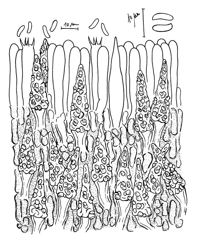 Basidiocarpos efusos y membranosos, firmemente adheridos al principio, pero con los bordes que se desprenden fácilmente; la superficie del himenio es lisa o con pequeños tubérculos, se agrieta al secarse y pasa de tonos grisáceos rojizos o violáceos a parda con la edad, con un margen blanco característico. Sistema hifal simple (monomítico) con todas las hifas provistas de fíbulas: las basales son gruesas y pardas (3-4 μm), mientras que las subhimeniales son más finas (2,5-4 μm), hialinas o pardas. Los cistidios (lamprocistidios) son llamativos, de 40-80 × 6-14(-18) μm, inicialmente delgados y luego incrustados y gruesos; faltan gloeocistidios y dendroifidios. Los basidios miden 30-50 × 5-7 μm, con cuatro esterigmas, y las basidiósporas son curvas (alantoides), de 6,5-9 × 2-2,5 μm, lisas, hialinas y no azulantes con yodo (IKI-).
