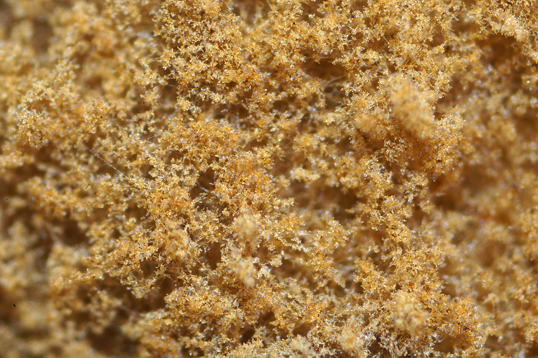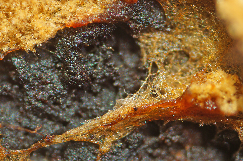 Basidiocarpos anuales, efusos, de hasta 1,0 mm de grosor, separables en estado fresco y seco a adherentes, con aspecto de pergamino, casi quebradizos en seco y luego agrietados, dejando al descubierto el subículo; áreas fértiles discontinuas a mayormente continuas, de sepia a marrón opaco, a veces con tintes rosados, rara vez verde opaco. Superficie himenial al principio lisa, volviéndose fuertemente coliculosa a granulosa, más lisa hacia el margen. Subículo concoloro con las áreas fértiles, fibroso. Margen estéril radiado-fibriloso a velloso, ocráceo a marrón óxido pálido, a veces concoloro con las áreas fértiles. Cordones evidentes. Hifas subiculares de 3-4 (4,5) micras de diámetro, septadas, con fíbulas frecuentes, de paredes delgadas o con engrosamiento aparente, de color amarillo parduzco pálido a pardo amarillento pálido; cordones de 10-25 (35) micras de diámetro, pardo amarillento pálido, ramificados. Hifas individuales de (1,5) 2-3 micras de diámetro, de paredes delgadas, de color amarillo pálido, fibuladas. Hifas subhimeniales de 2,5-4 micras de diámetro, con fíbulas, de paredes delgadas, concoloras con el subículo, se hace evidente un difusado de color pardo, cuyo contenido a veces aparece granular rojizo en preparaciones acuosas, pero se vuelve ocre en KOH. Basidios de 35-45 (50) x 7-9 micras, con fíbula basal, frecuentemente con septos transversales, claviformes, con 4 esterigmas. Cistidios ausentes. Basidiósporas de 7-8 micras de largo en la cara lateral y frontal, triangulares (con la parte proximal ensanchada) o a veces lobuladas en la cara frontal y elipsoide lateral, equinuladas, de color amarillento a marrón pálido en KOH al 3% y en agua destilada.