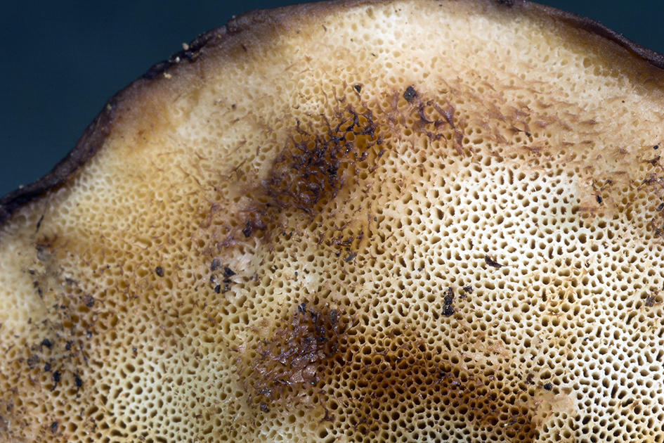 MACROSCOPÍA: Basidiocarpos anuales, sésiles o con el margen superior replegado, solitarios o reunidos, imbricados o fusionados lateralmente, a veces con pequeñas areas resupinadas interpuestas, carnoso y suberoso en fresco, rígido y quebradizo en esta seco, pueden medir algunos cm de longitud, cubren grandes superficies de madera, con un espesor de 10-15 mm, que llega a 20-30en la parte adherida al sustrato. Margen delgado, ondulado, doblado hacia abajo cuando esta seco, se desprende fácilmente del sustrato. Superficie estéril inicialmente finamente tomentosa, arrugada, cubierta de de finas flocosidades, no zonada, blanca, después rojiza y lampiña; el color de todo el basidioma primero se vuelve amarillento y luego marrón herrumbroso cuando se toca o se frota. Superficie poroide blanquecina, rojiza oscura al tacto. Poros redondos-angulares, a veces sinuoso, 3-5 por mm. Disepimentos delgados, enteros y pubescentes, se tornan laceradas, dentados y lampiños en los ejemplares adultos. Contexto blanco, carnoso-fibroso, luego frágil, enrojece muy fácilmente y tiene un espesor que alcanza los 15-20 mm. Túbulos del mismo color que el contexto o más oscuros y tiene un espesor de 5-10 mm. MICROSCOPÍA: Sistema de hifas monomítico. Hifas generativas hialinas, paredes finas o poco engrosadas, provistas de fíbulas, poco ramificadas, muy entrelazadas entre sí y con un diámetro de 2,5-6,5 micras en el contexto; también son visibles hifas generativas con paredes muy gruesas y un diámetro de 10-12 micras; en la trama del los disepimentos las ramificaciones son más numerosas, la tendencia es casi paralela y el diámetro es de 2.5-4 micras. En el contexto y en la trama hay hifas sinuosas y con un contenido aceitoso. Las hifas del tomento en la superficie pileica son amarillentas o marrones, unidas en cordones y aglutinadas. Basidios clavados, con 4 esterigmas y fíbula basal, 12-20 x 3.5-4.5 micras, los esterigmas son delgados y miden de 2,5 a 3,5 micras. Cistidios ausentes, a veces son cistidiolos fusionados con los basidios. Esporas hialinas, lisas, paredes delgadas, gutuladas, desde cilíndricas algo curvadas hasta ampliamente alantoides, 4-5.5- (6) x 13:5-14:00 micras. HÁBITAT: Especie que fructifica en madera muerta de coníferas, a menudo sobre ramas y troncos aún en pie o sobre copas, cavidades, hendiduras presentes en la madera. Agente de podredumbre parda.