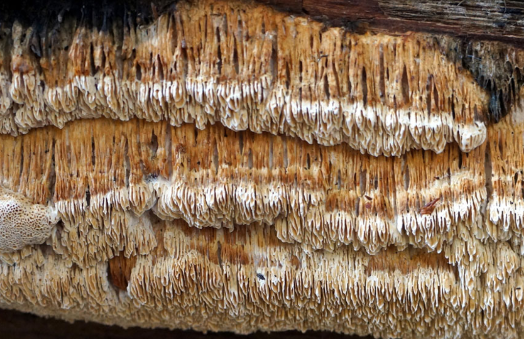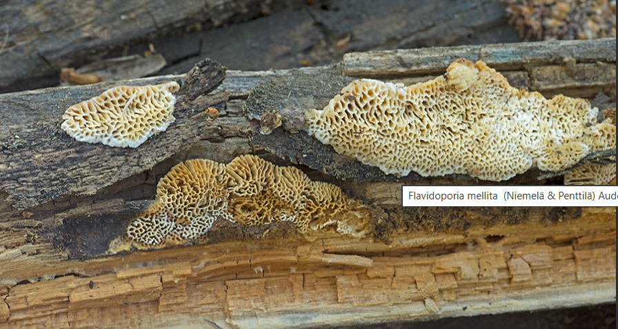 Observaciones: Antrodia mellita se caracteriza: Basidiocarpo resupinado, rara vez con falsos sombreros nódulosos, de color amarillo miel a ocráceo. Poros de aprox 1 por mm, mayormente angulares. Basidiósporas 5,5-8 x 2,5-4 micras. Sustrato:Populus tremula.