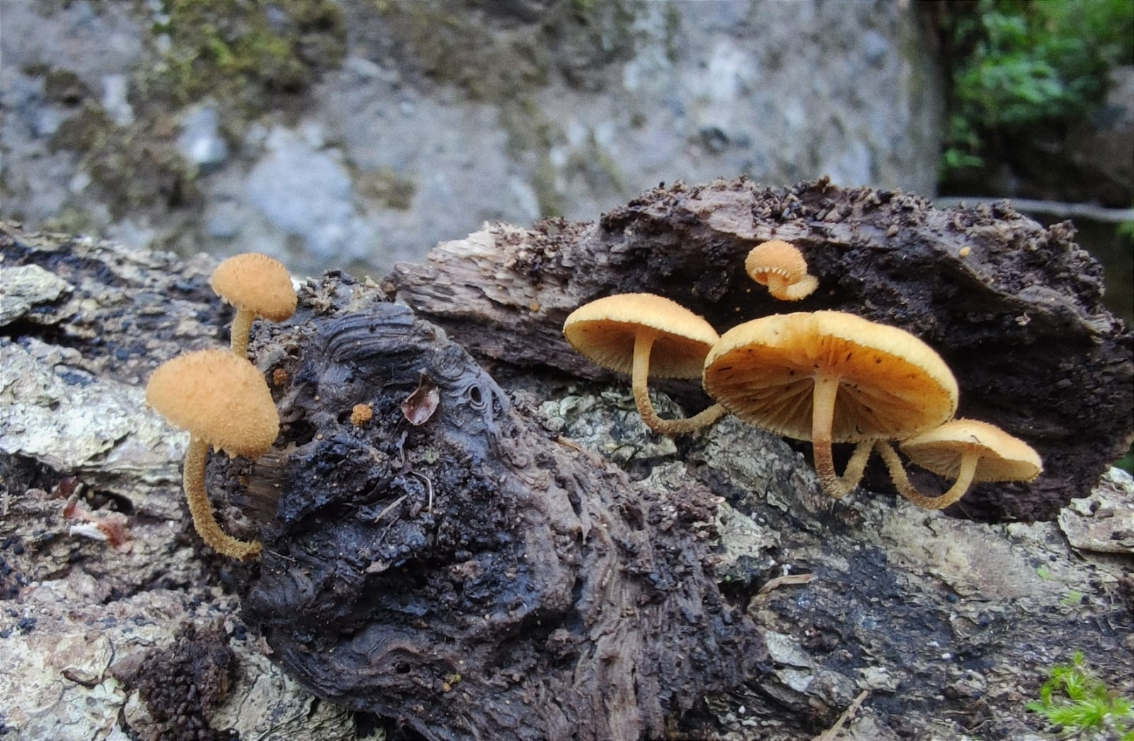 MACROSCOPÍA: Sombrero de hasta de 6 mm de diámetro, prácticamente hemisférico. Cutícula de color amarillento-ocre claro, completamente cubierta de furfuraciones naranja-ocre más oscuras. Borde denticulado por la presencia de furfuraciones más grandes y triangulares. Láminas adnatas, ventrudas, gruesas, de color blanco-cremoso al principio para terminar de color pardo al madurar, borde irregular, ligeramente aserrado y concolor o ligeramente más claro, con lamélulas. Pie de 7 mm, central, cilíndrico, curvado, concolor al sombrero y también recubierto por furfuraciones de color ocre, mucho más grandes y patentes en la base del pie. MICROSCOPÍA: Esporas de 5.6-7.4 x 3.7-4.7 micras, paredes gruesas, elipsoidales a ligeramente ovoides, a veces ligeramente aplanadas por un lado, lisas, de color amarillo-pajizo. Basidios claviformes, tetraspóricos, cortos. Queilocistidios cilíndrico-capitados, ligeramente sinuosos y con fíbulas. Caulocistidios con dos morfologías: unos cilíndrico-capitados, parecidos a los queilocistidios, bastante más sinuosos y con al menos una célula basal más globosa y otros con aspecto más piriforme-fusiforme. Cutícula cubierta por esferocistos que en ocasiones tienen un pigmento parietal discontinuo ocráceo. HÁBITAT: Restos leñosos