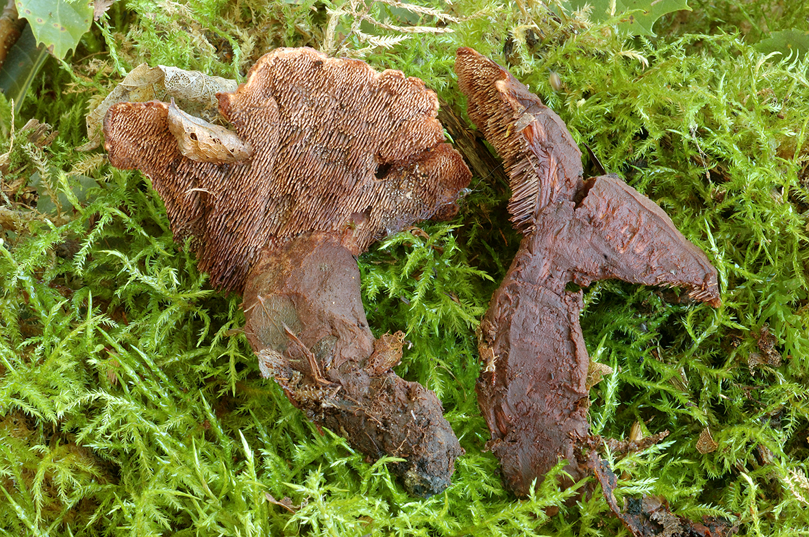 Basidiocarpo pileado estipitado, simple o concrescente. Píleo de 4-8 cm de diámetro, por lo general plano convexo. Margen ondulado. Superficie del píleo marrón claro a marrón, velutina, reticulada, plegada radialmente, con escasas zonas concéntricas. Himenóforo hidnoide. Dientes de hasta 6 mm de longitud, no decurrentes, blanquecinos, posteriormente marrón púrpura. Estípite corto, de 2-6 x 1-3 cm, irregular con base radicante, concoloro con el píleo. Contexto coriáceo, suberoso, doble tanto en el píleo como el estípite, concoloro con la superficie del pileo, es frecuente la presencia de manchas en el contexto del estípite, con potasa vira a violáceo y posteriormente a verde oliva. Olor y sabor fúngicos. Esporada parda. Sistema de hifas monomítico. Hifas generativas de hialinas a castaño pálido, sin fíbulas, de 3-5 micras de de diámetro. Basidiósporas subglobosas,6-7 x 4,5-6 micras, de tuberculadas a lobuladas, color castaño, no amiloides.