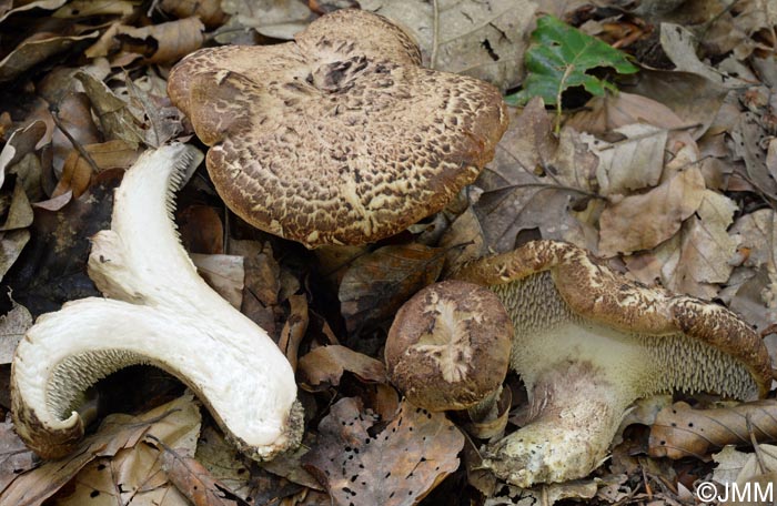 Basidiocarpos con sombrero y pie. Sombreros escamosos, coriáceos, de colores oscuros y que frecuentemente se resquebraja en placas, al principio convexo y al madurar plano convexo con el centro algo deprimido, ondulado y lobulado. Cutícula separable, se rompe en suaves escamas erectas, de color pardo o pardo-ocráceo y distribuidas de forma concéntrica. Himenóforo compuesto de aguijones gruesos. Pie cilíndrico, con la base generalmente curvada y algo radicante, recubierto con aguijones dispersos, de color crema y pardo grisáceos en los ejemplares maduros. Contextocompacto, duro, de color cremoso, luego grisáceo. Olor fúngico y sabor suave. Basidiósporas de 6,5-7,5 x 5,5-6,5 micras.