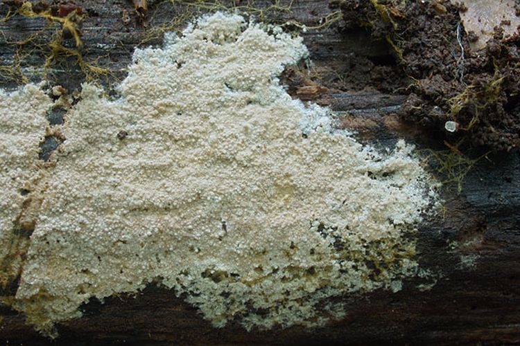Basidiocarpo efuso, separable, hipocnoideo, que se torna pelicular membranoso blando, bastante quebradizo al secarse, de hasta 0,3 (0,5) mm de grosor. Superficiehimenial al principio discontinua, porosa, en penachos, luego continua, lisa a granulosa, de color marrón grisáceo uniforme, marrón a marrón oscuro, normalmente con un ligero tono oliváceo. Subículo escaso a desarrollado, arachnoide, hipocnoideo, laxo, rara vez fibroso suave, de marrón pálido a marrón, más pálido a casi concoloro con el área fértil. Margen indistinto ,marrón muy pálido o amarillo pálido. Rizomorfos fácilmente visibles en el subículo, grietas del sustrato y con poca frecuencia en el margen, compactos, flexibles, frecuentemente ramificados, de marrón a marrón oscuro. Sistema hifal monomítico o dudosamente dimítico con hifas muy delgadas, de paredes gruesas y muy ramificadas en la superficie de los rizomorfos. Hifas generativas mayormente con septos primarios fibulados. Hifas en el subhimenio regulares y de células cortas, de 3-4 micras de ancho, de paredes delgadas, a menudo ramificándose desde las fíbulas, hialinas a subhialinas o de color marrón amarillento muy pálido. Hifassubiculares regulares, de células largas, de 3,5-5 micras, pared engrosada, normalmente ramificada cerca de los septos, a veces con anastomosis simple, de color subhialino a marrón amarillento o marrón pálido. Cistidios filiformes, hifoideos, poco o nada expandidos en el ápice, de hasta 110 (160) x 2-3 (4) micras de ancho, 3–4 (5) micras de ancho en el ápice. Basidios inmaduros subglobosos a piriformes, luego claviformes a suburniformes, a menudo transversalmente septados y pronto colapsados ??en la mitad superior, hialinos a marrón amarillento muy pálido, 30-50 × 8–10 micras, (2) 4 esterigmas. Basidiósporas de contorno irregular a sinuoso, en vista lateral mayoritariamente elipsoides con una cara adaxial aplanada, rara vez más o menos claramente lobuladas, en vista frontal ligeramente ovoides, a menudo con contorno sinuoso, ligeramente trilobuladas; en vista polar, de más o menos globosas a irregularmente globosas, 8–10 × 6,5–7,5 × 8–9 , equinuladas, a veces con coronas dorsales y laterales, de ocráceas a parduscas.