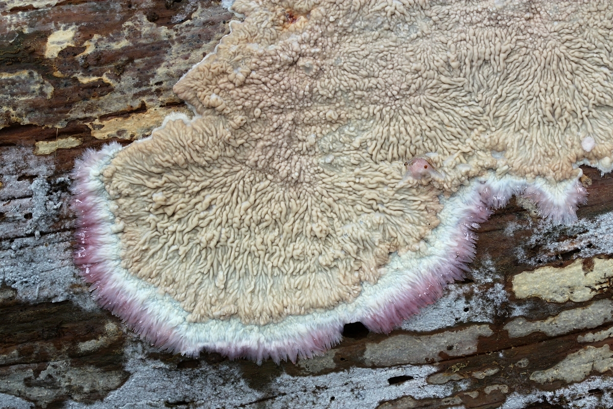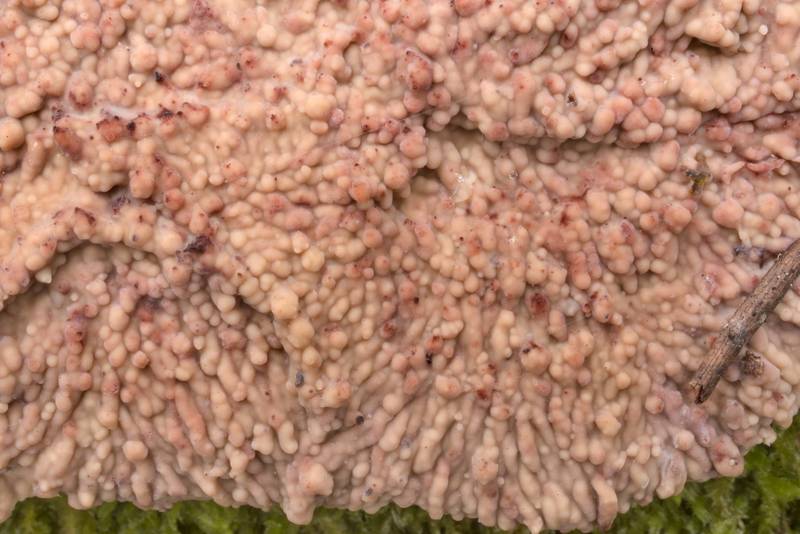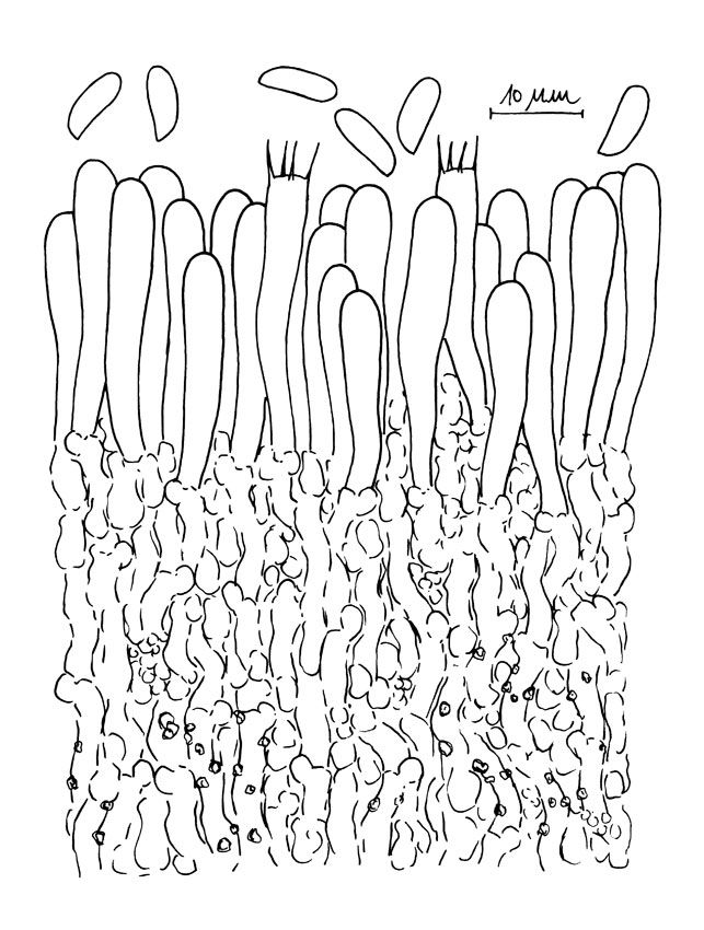 Basidiocarpo resupinado, adnado, orbicular, al principio, luego confluente y efuso, de céreo a gelatinoso. Himenóforo tuberculado a papilado con crestas irregulares en fresco, más o menos liso en seco, de blanquecino a grisáceo con tintes parduscos. Margen fibriloso. Sistema hifal monomítico. Hifas con fíbulas, hialinas; hifas subhimeniales indistintas y dispuestas en una matriz gelatinosa densa, de paredes delgadas, de 2-3 micras de ancho, hialinas; hifas subiculares paralelas al sustrato, con paredes distintas, de 2-5 micras de ancho, en el subhimenio incrustadas y dispuestas en una capa diferenciada. Cistidios ausentes. Basidios estrechamente claviformes, de 25-35 x 5-6 micras, con 4 esterigmas y una fíbula basal. Basidiósporas subcilíndricas, lado adaxial recto, 6-9 x 2,5-3 micras, lisas, paredes delgadas, hialinas, IKI-.