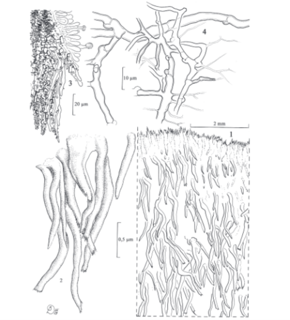 Basidiocarpo efuso. Himenóforo hidnoide, con espinas delgadas de hasta 2 mm de longitud. Sistema de hifas dimítico con hifas generativas fibuladas y algunas hifas esqueléticas capilares en el subículo; las ramas laterales estrechas se forman a partir de hifas ampliamente basales. Contexto compuesto por hifas paralelas, densamente cubiertas de cristales granulares o baciliformes. La última parte de la hifa en el contexto a veces presenta una induración resinoide. Cistidios fusiformes con un glóbulo resinoide ancho en el ápice. Basidiósporas estrechamente cilíndricas hasta más o menos elipsoides o ligeramente piriformes de 4-6,6 × 2-3,6 micras.