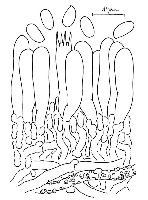 Basidiocarpo anual, resupinado, efuso, subceráceo. Himenóforo odontoide, con acúleos cónicos, más oscuros en la base y más claros hacia el ápice, indivisos o algunos bifurcados, 08,-1,2 mm. Margen indistinto. Sistema de hifas monomítico. Hifas generativas delgadas, de 2-3 micras de ancho, fibuladas, ligeramente engrosadas y densamente confluentes, de 2-3 micras de ancho; hifas en los extremos de espinas delgadas, capitadas y también obtusas. Cistidios o cistidiolos capitados, de 20-25 micras de largo y 4-5 micras de ancho. Basidios claviformes, de 15-20 x 4-5 micras, 4 esterigmas y fíbula basal. Basidiósporas hialinas, delgadas, lisas, elipsoides, no amiloides, de 5-5,5 (-6) x 2,5-3 micras.