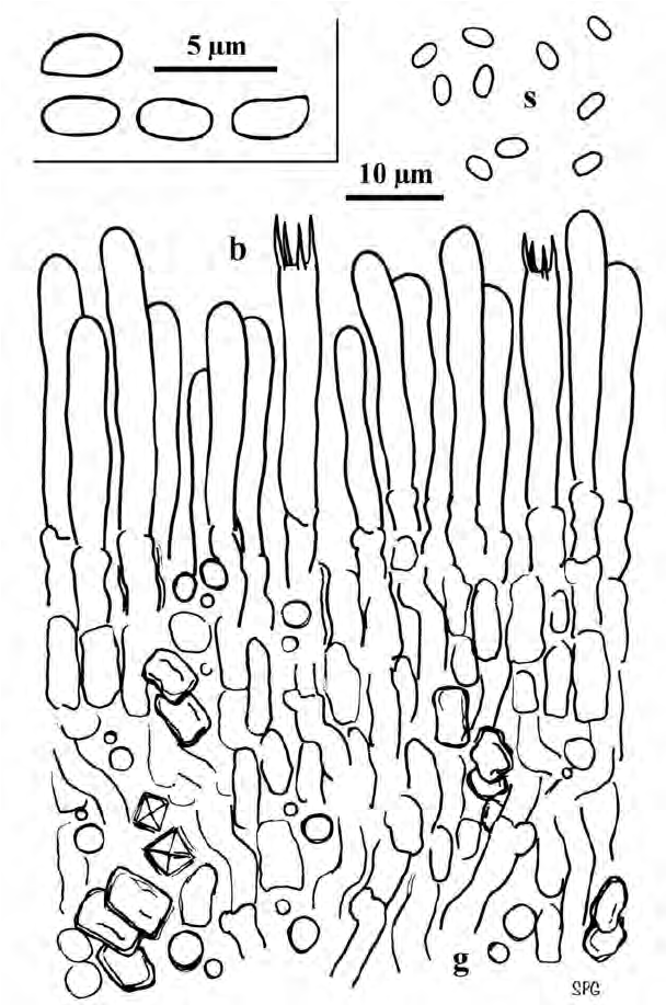 Basidiocarpo anual, resupinado, adnado, efuso, de color blanquecino a crema. Margen determinado Himenóforo liso. Sistema hifal monomítico. Hifas con fíbulas, pared fina, de 2,5-3 micras, aglutinadas e indiferenciadas. Cistidios ausentes. Basidios cilíndricos a subclavados, de 20-25 × 4-5 micras, con 4 esterigmas, con una fíbula basal. Basidiósporas estrechamente elipsoides, de 3-3,5 × 2-2,5 micras, lisas, de pared fina, IKI–.