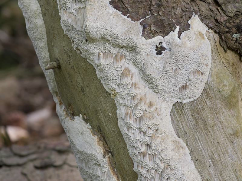 Basidiocarpos anuales, resupinados, de ligeramente pulvinados a planos, al principio como pequeñas manchas circulares, luego ampliamente efusos, de hasta 1,5 cm de grosor, blandos y ligeramente suverosos en estado fresco, friables y quebradizos al secarse al contraerse y curvarse. Superficie de losporos al principio de color blanco a madera, que se vuelve marrón al magullarse, con la edad y el secado de marrón fusco pálido a ocre pálido. Margen blanco, que desaparece con la edad. Poros angulares y en algunas zonas irregulares en estado seco, de 5 -7 por mm, más grandes en algunas zonas en estado seco. Subículo de blanco a ocre claro, más pálido que los tubos. Capa tubular concolora con el subículo, de hasta 15 mm de grosor. Sistema hifal dimítico. Hifas generativas con fíbulas, hialinas, paredes delgadas, de 1,5-2,5 micras de diámetro, a lo largo de los disepimentos a menudo con un ápice en forma de maza. Hifas de unión arboriformes con largas terminaciones en forma de látigo, con una parte basal larga y no ramificada, que al fragmentarse se presenta como hifas esqueléticas, de hialinas a amarillo pálido, paredes sólidas a gruesas, de 2,5-5 micras de diámetro. Cistidios ausentes. Cistidiolos fusoides presentes, de 20-25 x 3-5 micras. Basidios claviformes, con 4 esterigmas, de 12-20 x 4-6 micras, con una fíbula basal. Basidiósporas de oblongas elipsoides a cilíndricas, lisas, hialinas, negativas al reactivo de Melzer, de 4-6 x 2,5-3 micras.