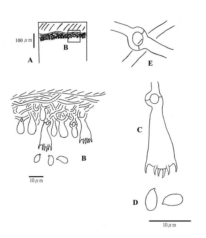 Paullicorticium ansatum: Se caracteriza por las fíbulas ansiformes, en forma de mango. Basidiósporas elipsoides, 4,5-6,5 x 2,5-3,5 micras.