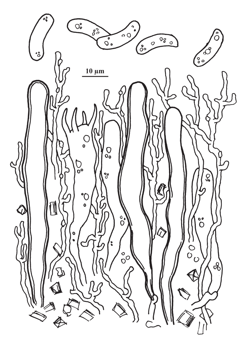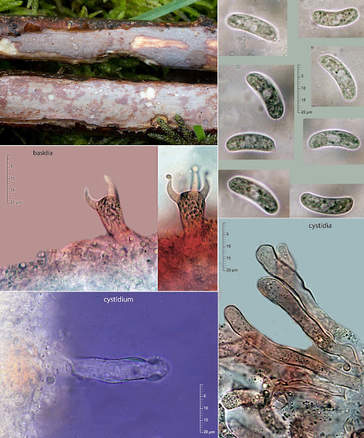 Basidiocarpo resupinado, adherido al sustrato, fuertemente decorticante, de consistencia cérea, blando en fresco, pruinoso en seco, mayormente liso, rara vez tuberculoso o granular, de color ocre grisáceo a parduzco u ocre oliváceo con tonalidades rojizas que se desvanecen a crema amarillento en especímenes secos y de herbario. Sistema hifal monomítico. Hifas hialinas, fíbuladas, sinuosas, de paredes delgadas, de 2-3 micras de diámetro. Dendrohifidios ramificados, a menudo incrustados, 1,5-2 micras de diámetro. Cistidios a veces difíciles de observar, presentan un contenido homogéneo, con fíbula basal, con forma tubular a cilíndrica y ápice redondeado, paredes ligeramente engrosadas, 75-120 (150) x 7-10 (12) micras. Basidios claviformes, pediculados, muy alargados, sinuosos y gutulados, al igual que los basidiolos, con fíbula basal, paredes ligeramente engrosadas que miden 100-120 x 8-10 (12) cm en la parte apical; esterigmas robustos, plegados hacia adentro y miden hasta 8-10 x 5 micras. Basidiosporas hialinas, lisas, alantoides, a veces con septo, germinan fácilmente, no cianofilas,17-20,5 x 5-6 micras